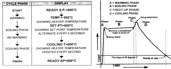 機(jī)器基本流程是:開機(jī)→加熱→蒸餾→反復(fù)加熱→冷卻→完成。詳細(xì)流程見下圖左邊,圖6。圖6中右邊為流程曲線特征。X軸是時(shí)間, Y軸是溫度。A,B,C,D是各個(gè)不同的特征過程。